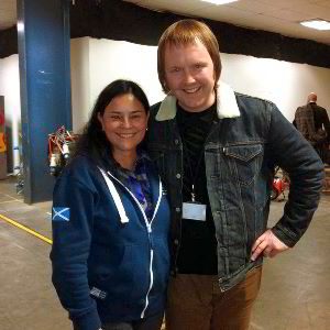 Wie schon gesagt gibt es bei Dreharbeiten lange Pausen zwischen den Takes. Es ist faszinierend zu beobachten, was in diesen Pausen passiert, vor allem, wenn es eine Szene mit vielen Schauspielern ist. In der Sekunde, in der der Regieassistent „Cut! Noch einmal!“ schreit, kommen Ameisenkolonnen von Maskenbildnern angelaufen und schwärmen zu den ihnen zugeteilten Schauspielern aus, Puderpinsel, Kämme und andere Gerätschaften griffbereit. Der Regisseur geht herum und gibt den Leuten Anweisungen – und diverse Spezialisten, so wie die Dialekt-Trainerin und der Gälisch-Experte (Àdhnamh Ó Broin, mit mir auf dem Foto; vielleicht haben Sie ihn schon in den „Outlander Gälisch“-Videos gesehen haben – er ist selbst ein echter Star), sind mit Rat und Tat zur Stelle.
