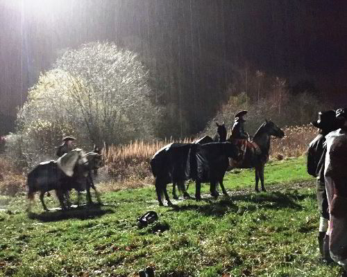 Heute war ein langer, kalter Tag an einem Drehort im Freien – bin morgens um viertel vor sieben aus dem Haus und war abends um acht zurück, nachdem ich den ganzen Tag in der Kälte gestanden hatte oder herumgelaufen war (und im Regen, der gegen Mittag einsetzte). Im Lauf des Tages habe ich mehrfach gehört, dass man Regen auf Fotos und vor allem auf Filmaufnahmen eigentlich nicht sehen kann; dass es regnet, erkennt man nur daran, dass die Haare der Schauspieler platt werden und tropfen. Die Tatsache, dass man es auf dem dritten Foto sehen KANN, sagt etwas darüber aus, wie heftig es geregnet hat …
