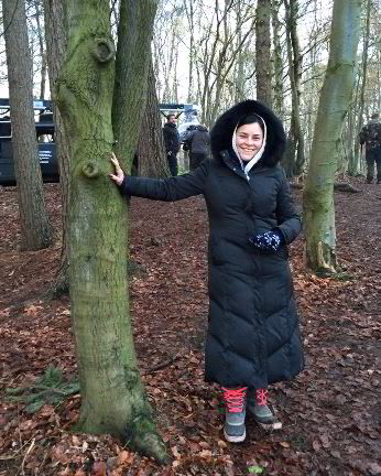 Ich bin immer wieder erstaunt, welche Anstrengungen das Produktionsteam unternimmt, für die Sicherheit aller Beteiligten zu sorgen und trotzdem die Bilder zu bekommen, die es haben will. Ich habe gesehen, wie vier Männer, die für die Gärtner-Crew arbeiten, Herbstlaub aus einem Laster in große Plastikbehälter geschaufelt haben, es einen steilen Hang hinauf geschleppt und auf den Weg geschaufelt haben – dann alles wieder zusammengerecht und an einer anderen Stelle verstreut haben, und so weiter und so fort, den ganzen Tag. Ganz zu schweigen davon, dass sie ständig Erde in Pfützen schaufeln, Grünzeug irgendwo wegnehmen und es anderswo wieder anbringen und so weiter. (Jemand, der das Foto von mir mit dem ultrawarmen Mantel gesehen hat – vor ein paar Jahren in Kanada gekauft, wo sie Ahnung von kaltem Wetter haben – meinte, alle anderen, die man sieht, hätten anscheinend Windjacken und Jeans an. Ich habe angemerkt, dass SIE wie verrückt hin und her rennen und Schwerarbeit leisten, während ich stillstehe und überlege. Auf diese Weise erzeugt man nicht viel Körperwärme …)