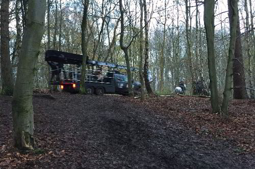 Auf dem dritten Foto ist der Kranwagen mit der Kamera zu sehen, der den Pferden hinterherjagt. Manchmal ist der Laster vorausgefahren, manchmal hinterher. Wir hatten Anfang der Woche schon einmal hier gedreht, und der Regisseur hat uns erzählt, dass er diesmal im Vorfeld den Weg planieren lassen musste, weil der Schlamm so tief war, dass der Laster beim Bremsen ins Schleudern zu geraten drohte und sie Angst hatten, dass ein stürzender Reiter überfahren werden könnte.
